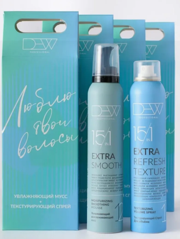 - Спрей 15в1 текстурирующий для объёма, DEW 200мл. Использование спрея значительно облегчает процесс стайлинга. Всего несколько нажатий спрея на сухие волосы придадут им потрясающий объем и текстуру, которая держится в течение всего дня. Продукт быстро впитывается, не оставляя ощущения липкости или утяжеления волос, что делает его идеальным выбором для ежедневного применения.
