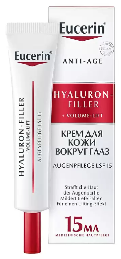 Применение: наносите утром и/или вечером на предварительно очищенную кожу вокруг глаз. [~DETAIL_TEXT] => Крем для ухода за кожей вокруг глаз HYALURON-FILLER + VOLUME-LIFT с SPF 15+UVA был специально разработан для устранения глубоких морщин и упругой кожи в деликатной области глаз, защищая все типы кожи от солнца. Благодаря SPF 15 с защитой от UVA, одобренный офтальмологами омолаживающий крем помогает предотвратить фотостарение (преждевременное старение кожи под воздействием солнца) и углубление морщин.