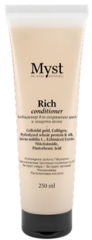 [~DETAIL_TEXT] => Кондиционер Rich помогает стабилизировать искусственный пигмент, плотно закрывает кутикулу и обеспечивает волосам гладкость, насыщенный цвет и здоровое сияние. Защищает окрашенные и натуральные волосы от выгорания и повреждений, вызванных ультрафиолетовым излучением, свободными радикалами и другими негативными воздействиями окружающей среды. Содержит мощный ухаживающий комплекс на основе растительных экстрактов, протеинов пшеницы и шелка, которые проникают в структуру волос и восстанавливают поврежденные участки, придавая волосам гладкость и блеск. Наночастицы золота выступают как катализатор для лучшего усвоения питательных веществ и защищают эпидермис и волосы от негативного влияния окружающей среды, а также предохраняют их от механических повреждений и термического воздействия.